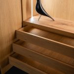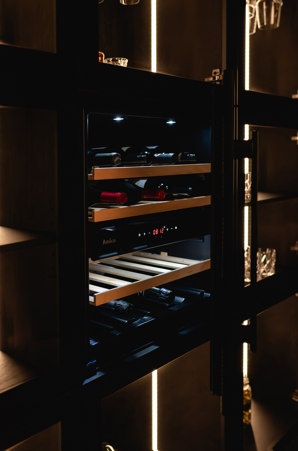 Głównym założeniem było wkomponowanie sprzętu AGD – chłodziarki na wina – w zabudowę meblową. Problem jaki pojawił się przy pierwszym etapie projektu okazał się początkiem ciekawej koncepcji. Sprzęt AGD o typowym gabarycie tj. 60x60x60 centymetrów miał być częścią zabudowy o głębokości 30 centymetrów. Na bazie wymiarów chłodziarki powstał moduł – box – o wymiarach 60×60 cm. Został on ośmiokrotnie powielony i wysunięty ponad lico jasnej zabudowy. Tak oto powstał duży, lewitujący i kontrastujący z pozostałą płytą meblową box. Jego centralnym punkiem jest chłodziarka na wina.