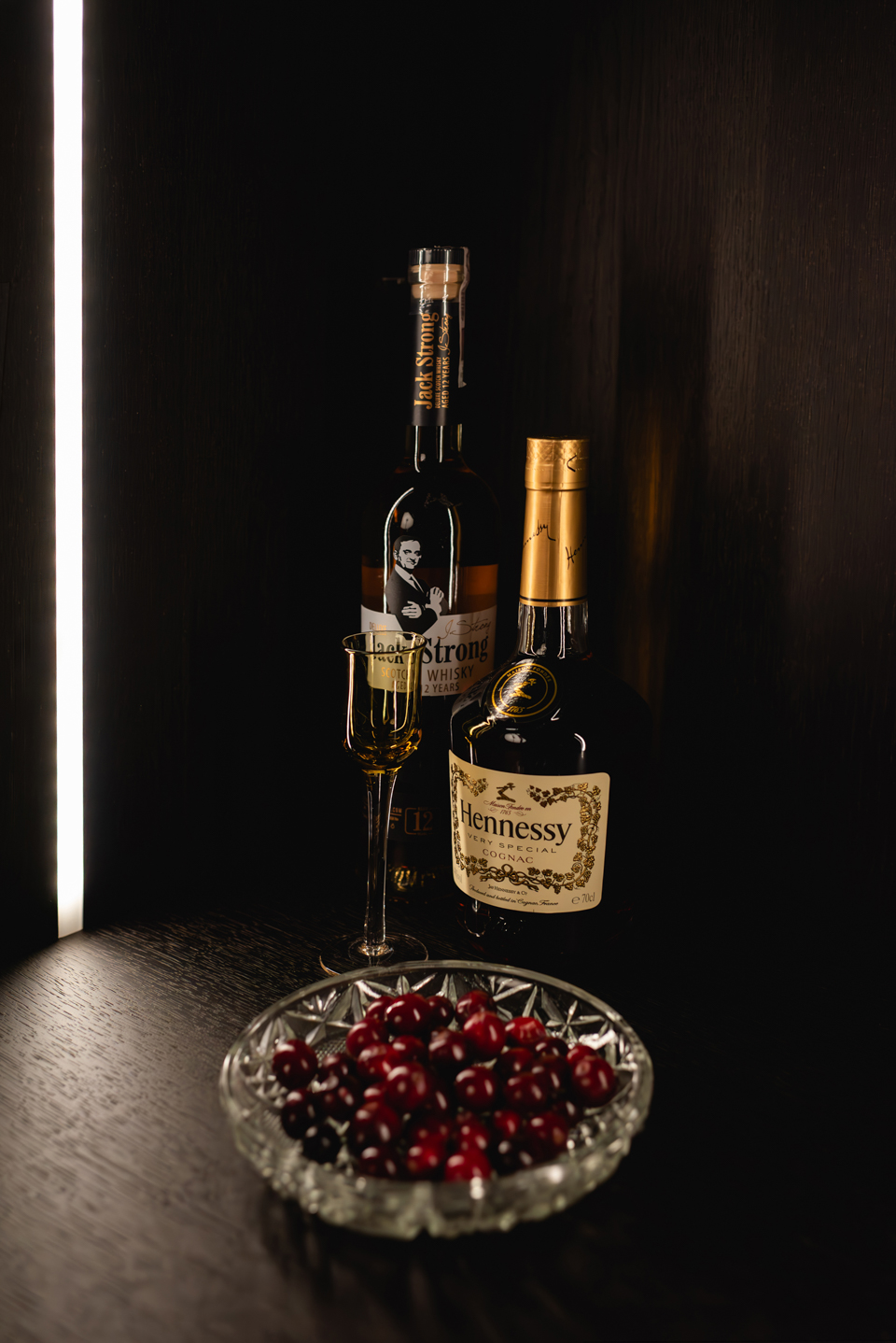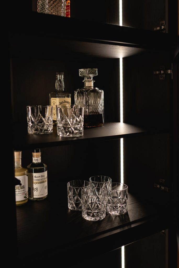 W projekcie postawiono na naturalne materiały i drogie, niestandardowe detale. Fronty barku pokryte są dębowym fornirem. Witryna to również fornir barwiony czarną bejcą. Wieszaki na kieliszki zostały wykonane z litego, frezowanego drewna dębowego.